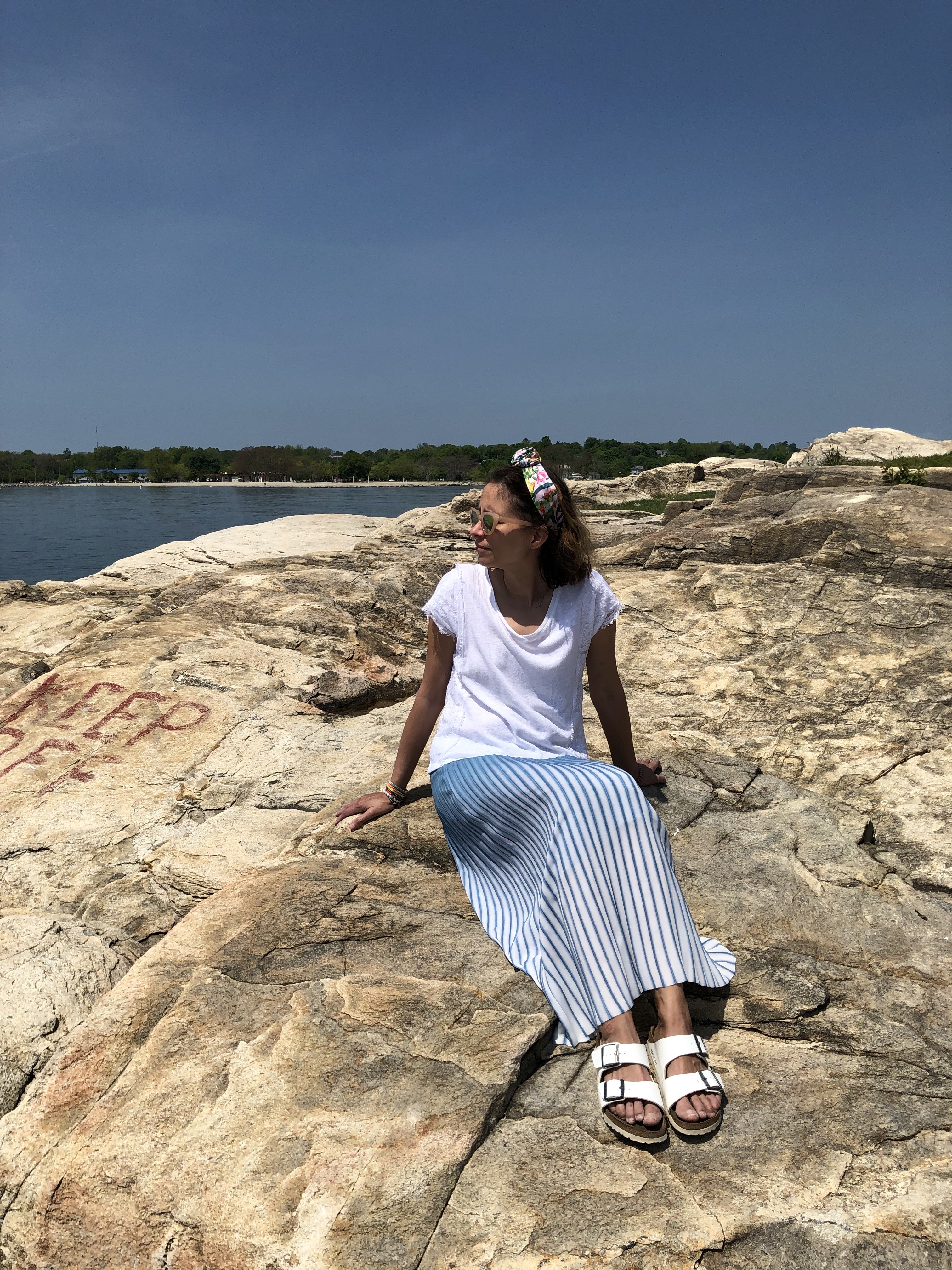 pleated ombre skirt, Anthropologie, sold out, similar here; Birkenstock sandals; topknot headband, similar here