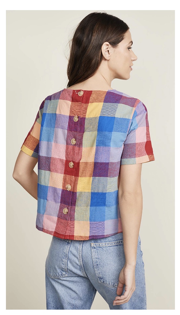 Fun Americana plaid print and I love the button back. Pair with a denim skirt