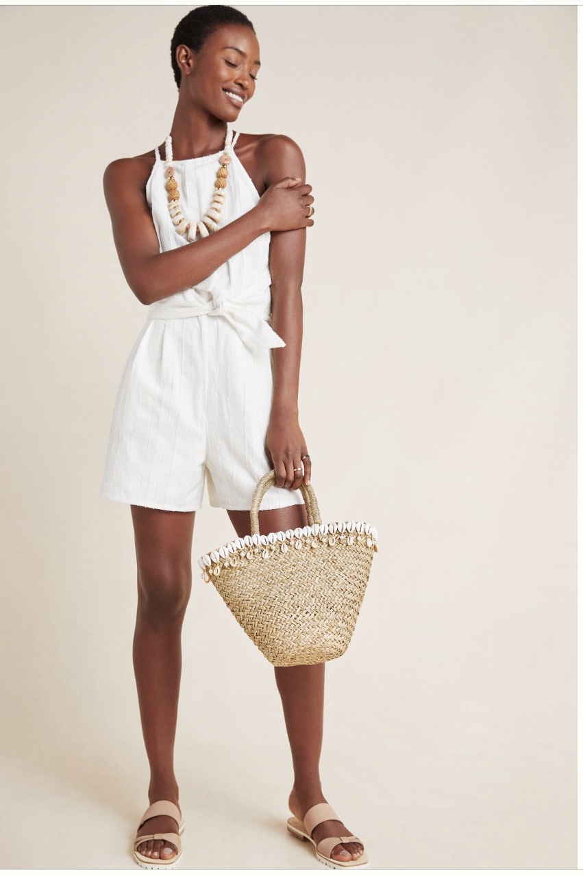 How about a white romper? I was drawn to the tie waist and the crisp textured fabric. This can be dressed up or down.